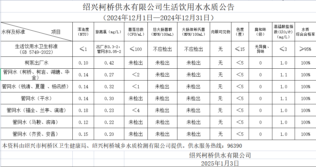 生活飲用水水質公告(2024年12月1日—2024年12月31日)