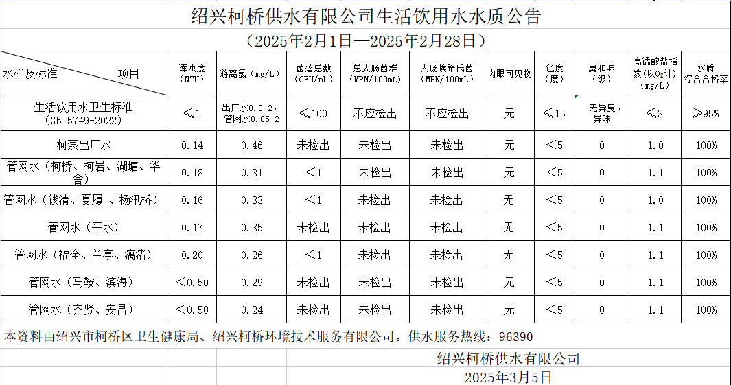 生活飲用水水質公告(2025年2月1日—2025年2月28日)