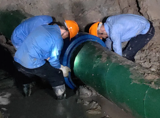 該管道由于受附近施工單位外力影響突發(fā)漏水,導(dǎo)致片區(qū)出現(xiàn)低壓供水,部分高層居民家中停水。同時(shí),由于管道基礎(chǔ)被水流破壞,導(dǎo)致管道連續(xù)破損。搶修人員通過堵漏與更新的方式,輪班作業(yè),并協(xié)調(diào)多輛應(yīng)急送水車全力保障居民生活用水需求。