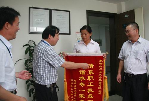 8月17日,家庭遭受火災(zāi)的供水公司分公司職工莫煜君在分公司負(fù)責(zé)人及村支書的陪同下來(lái)到集團(tuán)公司送上一面“情系職工救危困,和諧水務(wù)一家親”錦旗,感謝集團(tuán)工會(huì)對(duì)其的幫助。