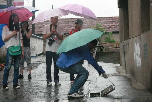 來(lái)到一個(gè)弄堂口,小吳說(shuō),你們不用跟我進(jìn)來(lái),里面只有一只表,等會(huì)還要原來(lái)返回。不一會(huì),他回來(lái)了。因?yàn)榕糜珠L(zhǎng)又窄,小吳只好撐下傘鉆出來(lái)。