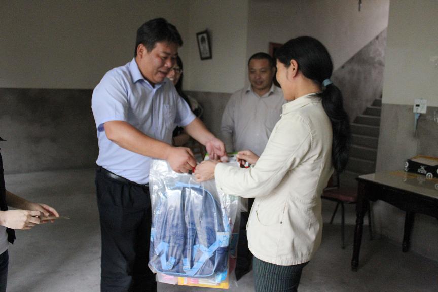 圖為濱海供水公司代表為馬鞍鎮(zhèn)結(jié)對(duì)貧困兒童送去書包的慰問(wèn)品及慰問(wèn)金