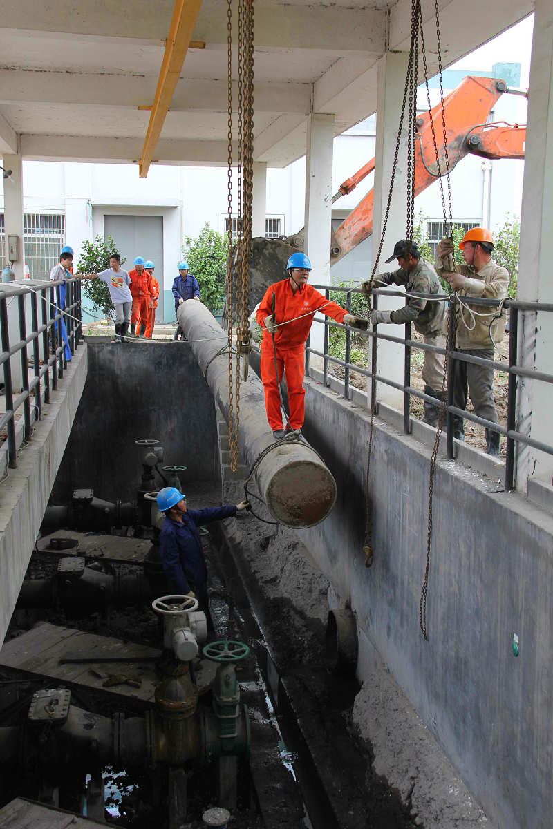 516上午800開(kāi)始,排水公司搶修人員對(duì)常年受酸性污水腐蝕的濱海北側(cè)1#泵站的80米出水總管進(jìn)行突擊更換。該污水總管的更換將直接影響到周邊科瑞化工、怡中印染等22家企業(yè)的生產(chǎn),為把受影響企業(yè)的損失減少到最低程度,排水公司制訂了詳細(xì)、周密的施工方案,計(jì)劃連續(xù)施工96個(gè)小時(shí)打好這場(chǎng)硬仗。