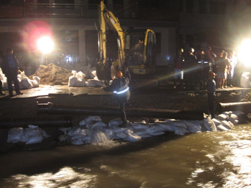21點10分,搶險準備工作全部完畢,供水管道搶修工作正式開始。搶險隊員分成兩隊實施搶修,在不到6米寬的狹長道路上,搶險隊員在被湍急洪水沖刷掏空的路基上,冒著隨時坍塌的危險,全然不顧個人安危沖鋒在前,狂風大雨下,突擊隊只有一個信念:就是要搶時間,趕進度,盡快讓全鎮百姓第二天能正常用水!