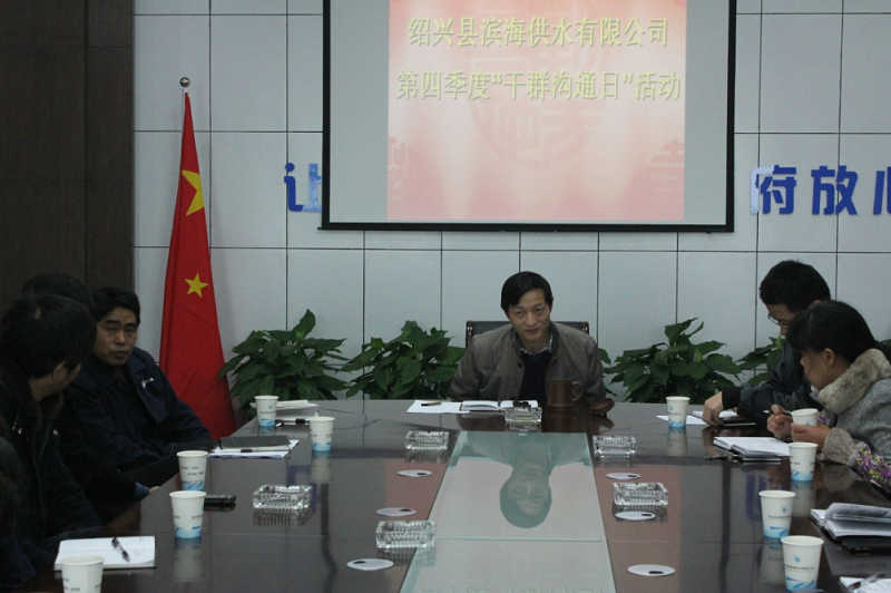 濱海水司第四季度“干群溝通日”活動于12月13日在三樓會議室舉行,本次活動圍繞基層班組規范化建設這一主題開展座談。公司領導、各部室負責人、班組長共19人參加座談。座談會上,與會人員就如何加強班組管理,更好地發揮基層班組作用,班組工作中的熱點難點問題進行“面對面”的溝通交流。