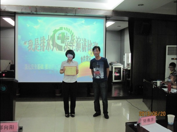 參賽選手在講的同時(shí)以PPT為背景為大家展示演講內(nèi)容,觀點(diǎn)鮮明,立意深刻,語(yǔ)言表達(dá)自然流暢,本次比賽結(jié)合“我是排水人”主題教育,以“強(qiáng)化安全基礎(chǔ)、推動(dòng)安全發(fā)展”為線(xiàn)索,體現(xiàn)了排水人積極向上的精神風(fēng)貌。最后來(lái)自柯海分公司的林佳獲得第一名,由鄭書(shū)記親自頒獎(jiǎng)。